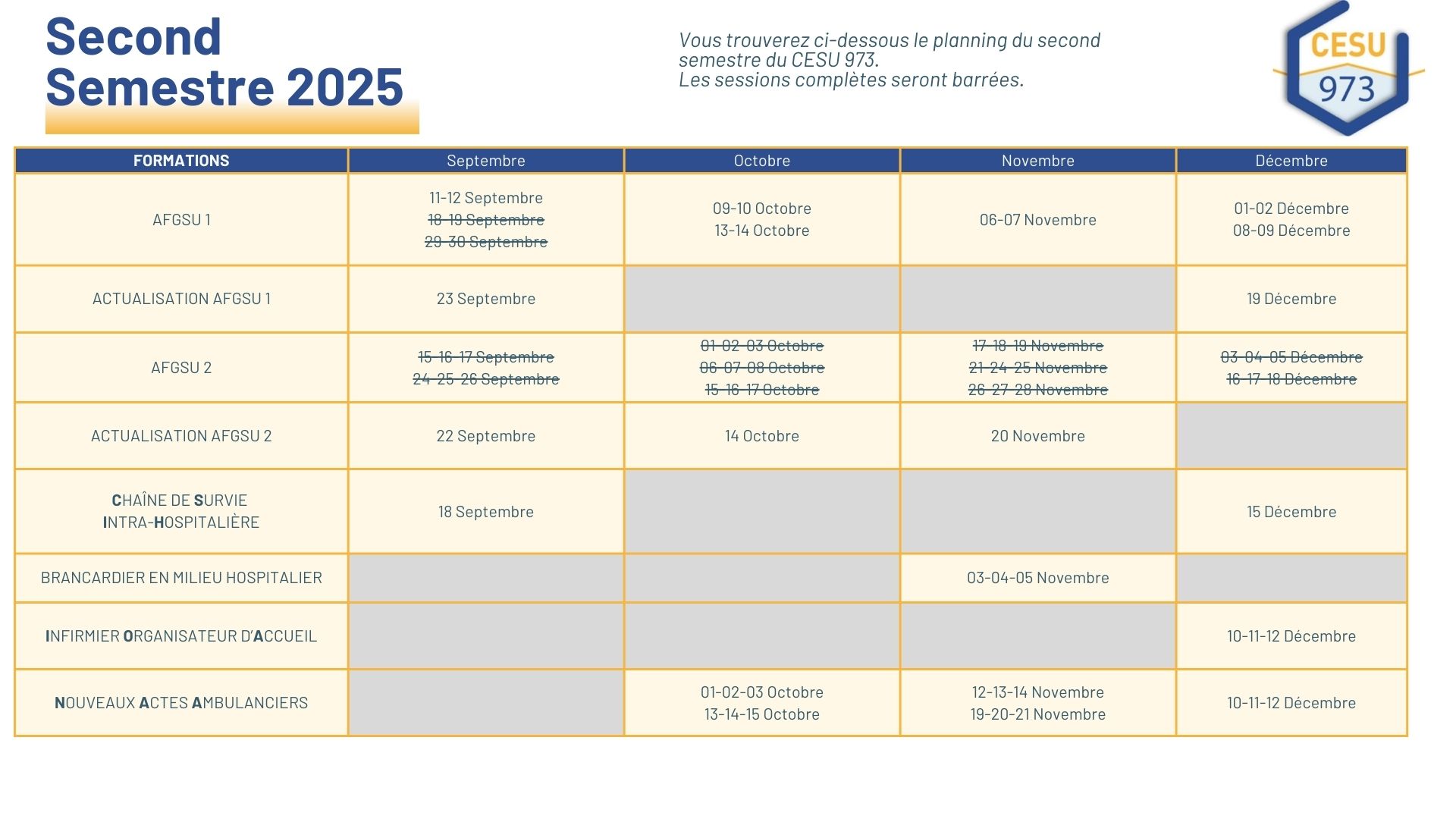 Le CESU 973 propose de nombreuses formations, relatives à la prise en charge de l’urgence médicale, destinées aux professionnels médicaux et paramédicaux en formation initiale et continue, en situation quotidienne et exceptionnelle, basées sur les recommandations scientifiques des sociétés savantes.